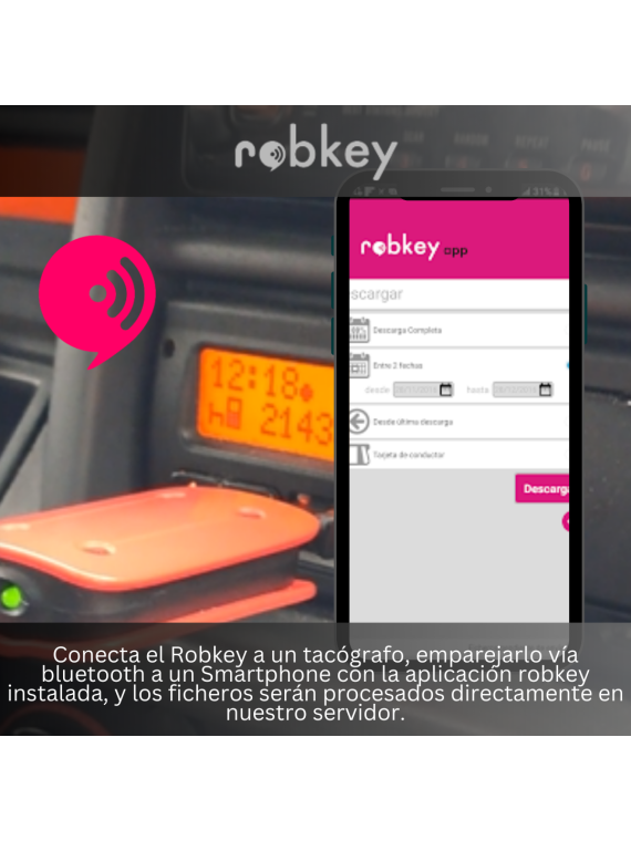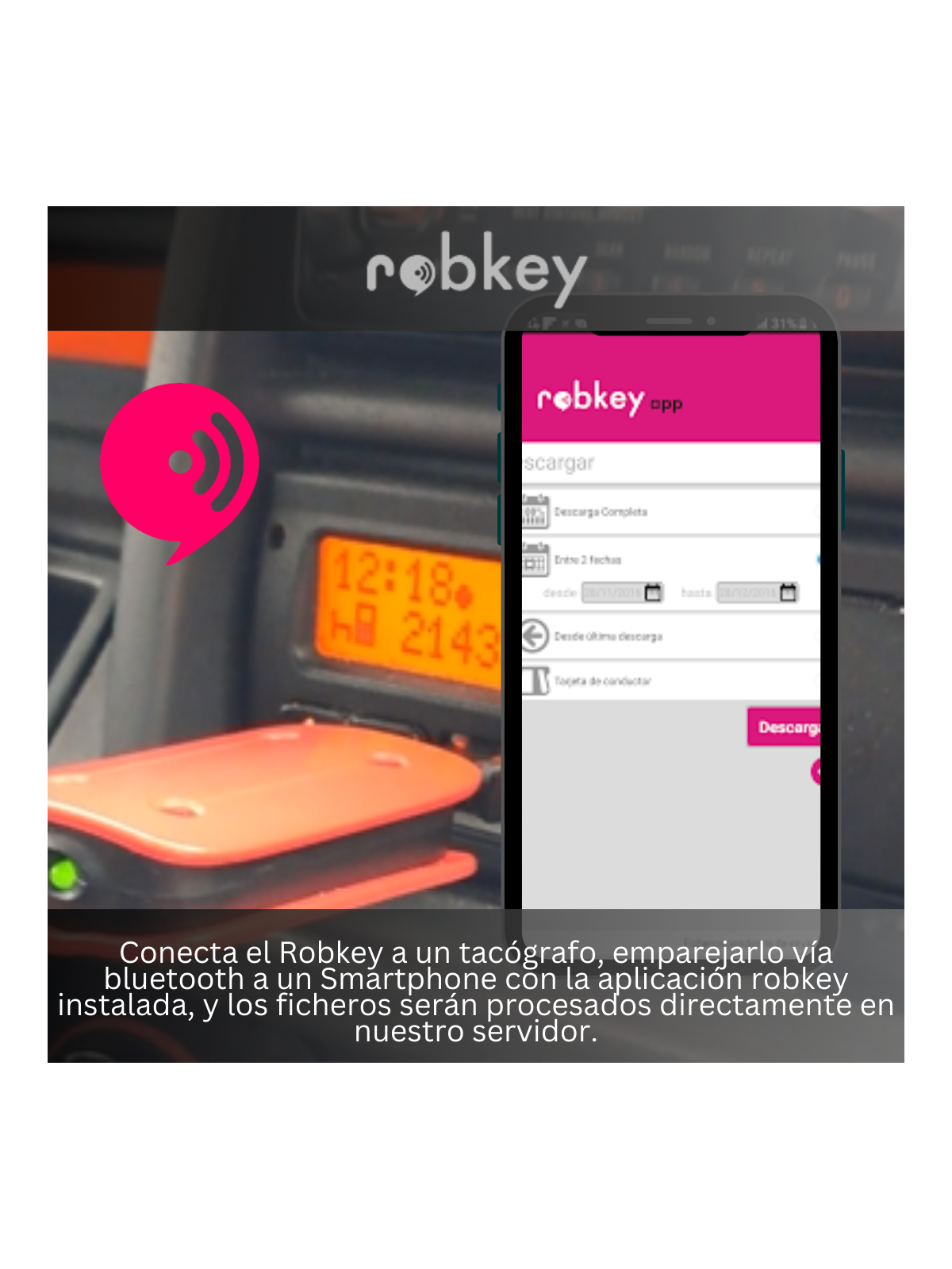 You just need to connect the robkey device to a tachograph, pair it via Bluetooth to a smartphone with the robkey app installed, and the files will be processed directly on our server.